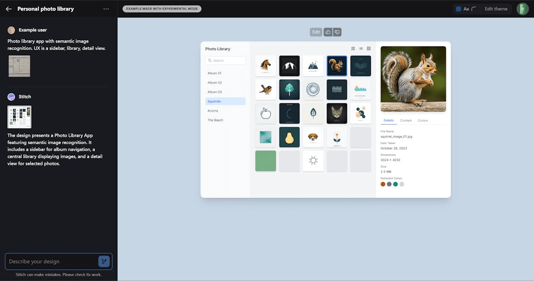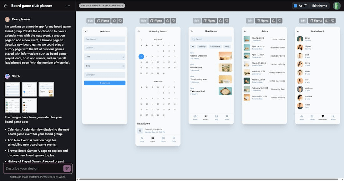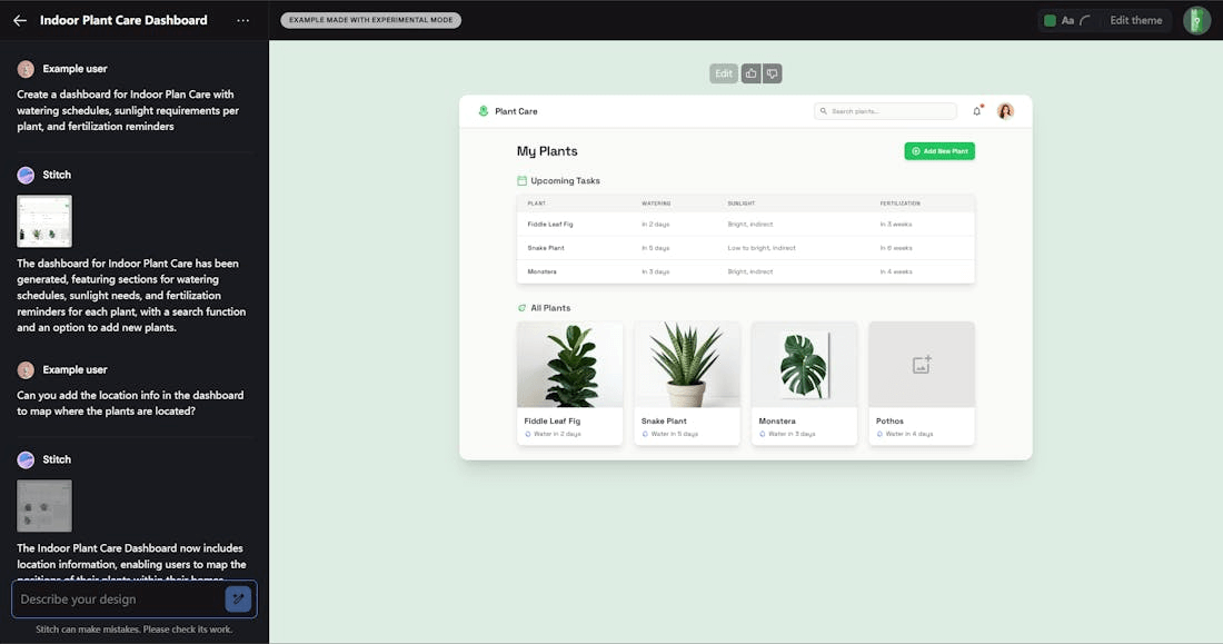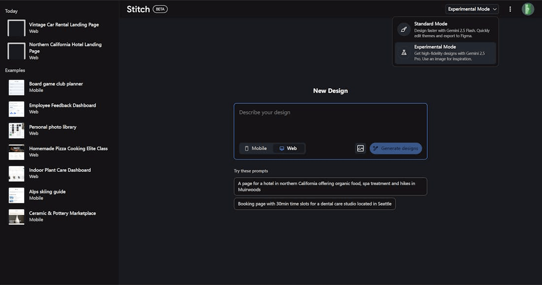 텍스트 프롬프트(예: “사진 공유 앱의 파스텔 테마 UI”) 또는 스케치 이미지를 업로드하여 원하는 UI를 설명합니다. Gemini 2.5 Pro 또는 Flash 모델을 선택해 디자인을 생성합니다.