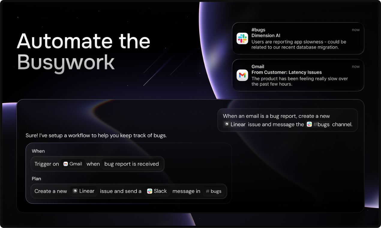 디멘션은 당신의 캘린더, 이메일, Slack, 그리고 Drive를 마치 인간 비서처럼 꼼꼼하게 읽어 들입니다. 그리고 스스로 생각합니다.
