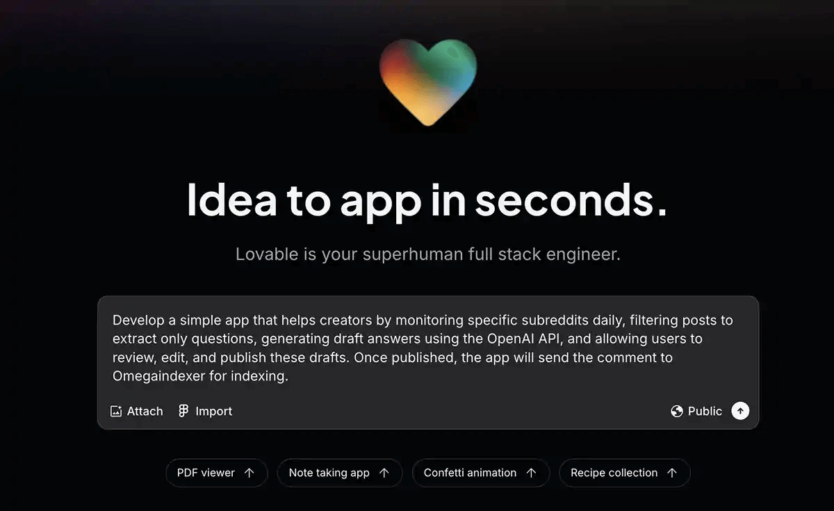 - 자연어 기반 앱 생성: 원하는 앱의 기능을 설명하면, Lovable이 자동으로 코드를 생성합니다.