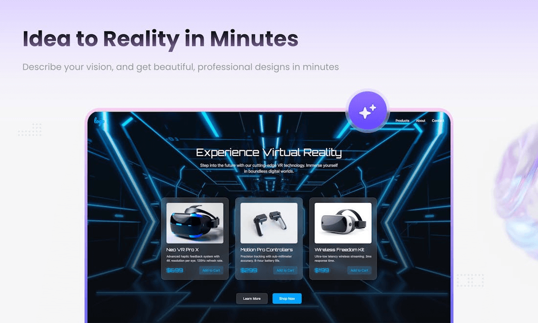 레디 AI의 핵심 기능은 사용자가 입력한 텍스트 프롬프트를 기반으로 웹사이트를 생성하는 것입니다. 예를 들어, "카페를 위한 모던한 디자인의 랜딩 페이지"와 같은 프롬프트를 입력하면, 해당 내용을 반영한 웹사이트를 자동으로 생성해줍니다.