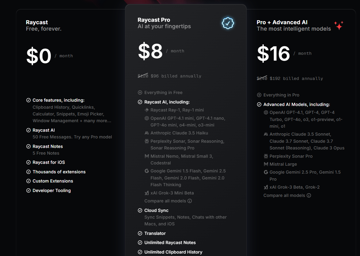 Raycast는 무료 플랜유료 Pro 플랜을 제공합니다. 공식 사이트 기준 최신 요금은 다음과 같습니다: