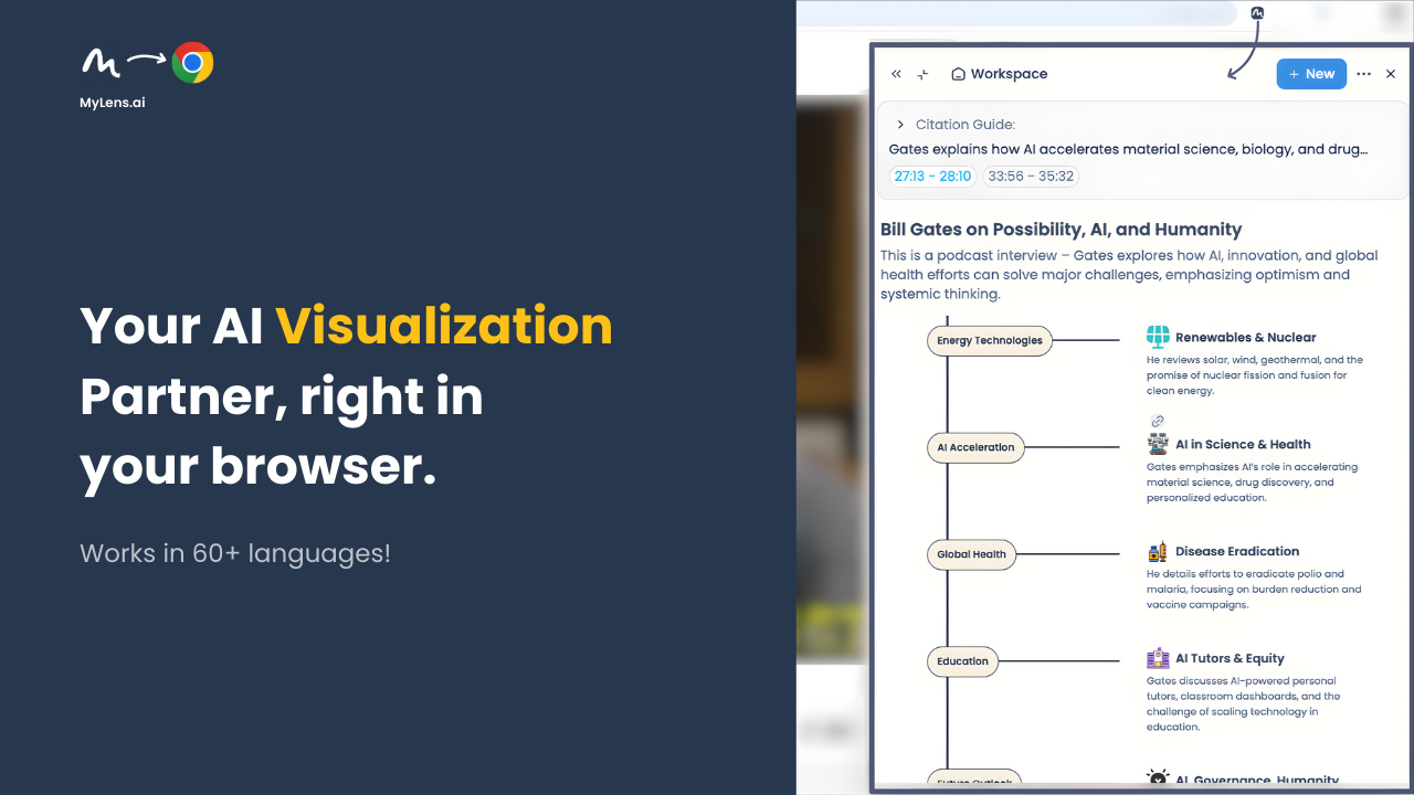 MyLens for Chrome, 바로 이 AI 시각화 파트너가 그 지옥 같은 정보 과부하 경험을 끝내줄 열쇠예요. 이 확장 프로그램은 당신이 보고 있는 페이지(긴 기사, 유튜브 영상, 심지어 PDF 문서까지)를 통째로 들이마신 다음, 핵심 인사이트를 추출해서 클릭 가능한 시각 자료로 바꿔줍니다. 마치 복잡한 건축 설계도를 펼쳐 보여주듯이 말이죠.