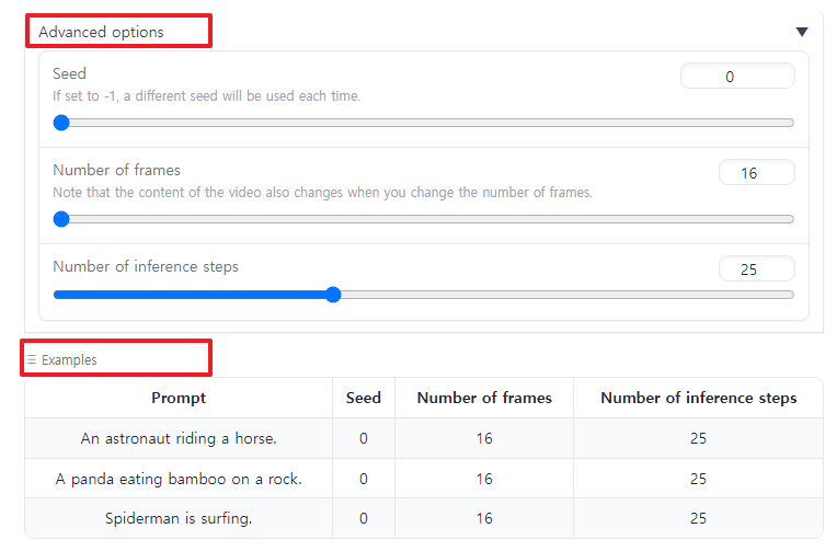 또한 그 아래에 3가지 정도로 다양한 옵션을 통해 영상을 변경할 수 있습니다. Seed는 각각 실행 마다 다른 결과를 보여줄 수 있는 랜덤성이고 그 아래는 영상의 프레임 수, 그리고 inference steps는 25로 보통 맞추어 사용합니다. 직접 해보시면서 숫자를 바꿔보시면 이해가 되실 겁니다.