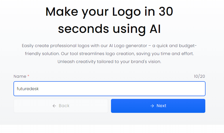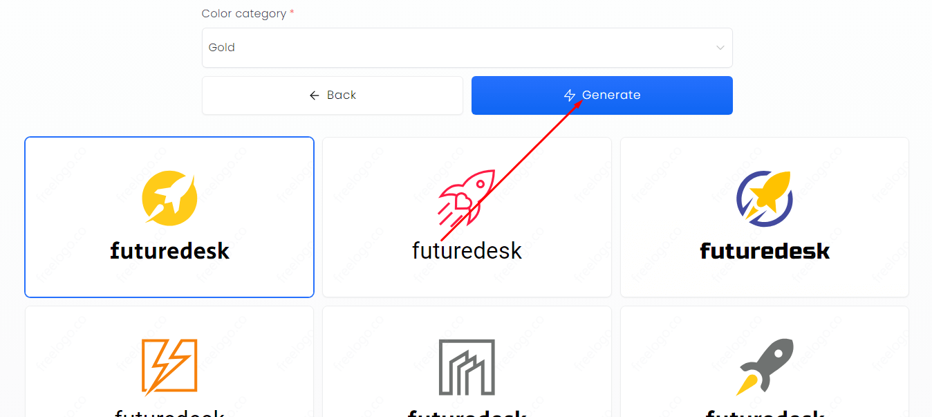 예시로 'futuredesk'라는 이름으로 브랜드 로고를 만들고 싶다고 한다면 위와 같이 브랜드 이름을 작성하고 'Next' 버튼을 누르면 다음 페이지로 넘어갑니다. 그다음으로는 자신의 비즈니스에 맞는 산업군을 선택하고 색상까지 선택해주면 끝입니다. 정말 간단하고 쉽습니다.