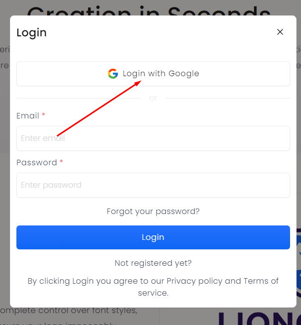 사이트를 방문하여 우측 상단에 있는 사람 아이콘을 누르면 로그인 창이 나오는데 여기서 익숙한 구글 계정으로 로그인을 눌러 간편히 가입이 가능합니다. 단, 로고 AI 제작하는데 별로도 가입이 필수는 아닙니다. 아이디어만 얻고 싶으시다면 아래 사용법으로 바로 넘어가셔도 됩니다.