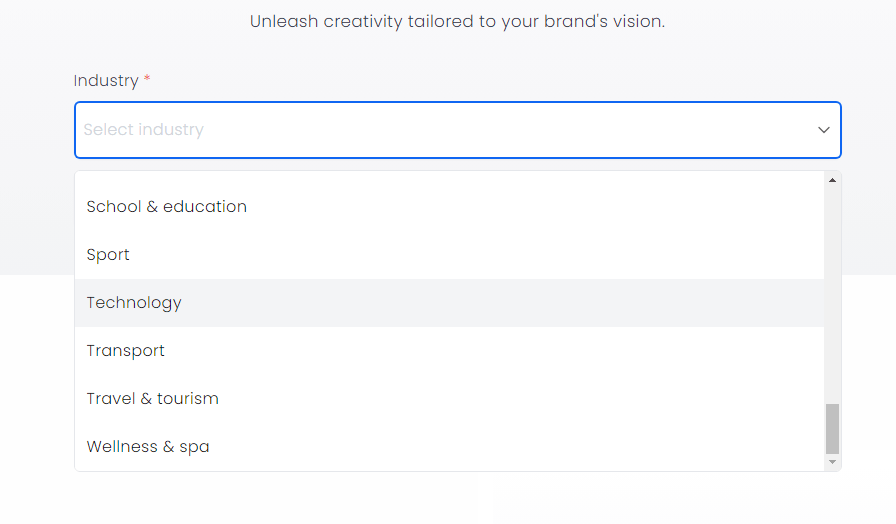 예시로 'futuredesk'라는 이름으로 브랜드 로고를 만들고 싶다고 한다면 위와 같이 브랜드 이름을 작성하고 'Next' 버튼을 누르면 다음 페이지로 넘어갑니다. 그다음으로는 자신의 비즈니스에 맞는 산업군을 선택하고 색상까지 선택해주면 끝입니다. 정말 간단하고 쉽습니다.