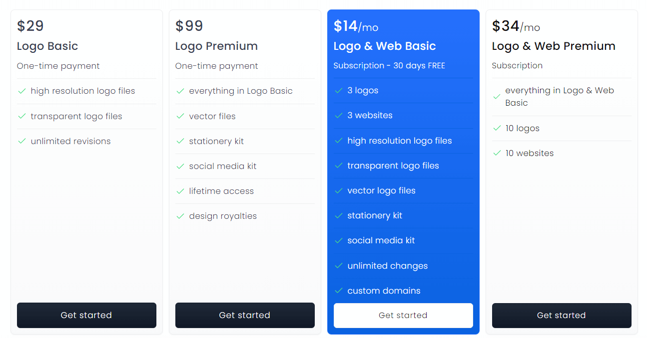 아이디어 기반으로 생성하는 것은 무료로 가능하지만, 결제를 할 경우에만 파일을 다운받을 수 있습니다. 위와 같이 4단계로 각각 한번 결제로 계속 사용할 수 있는 29달러, 99달러 모델과 구독 결제로 14달러, 34달러 이렇게 구분되어있습니다. 30일간은 무료 체험도 가능하니 급하게 로고가 필요하신 분들은 체험판으로도 큰 도움이 될 수 있을 것입니다.