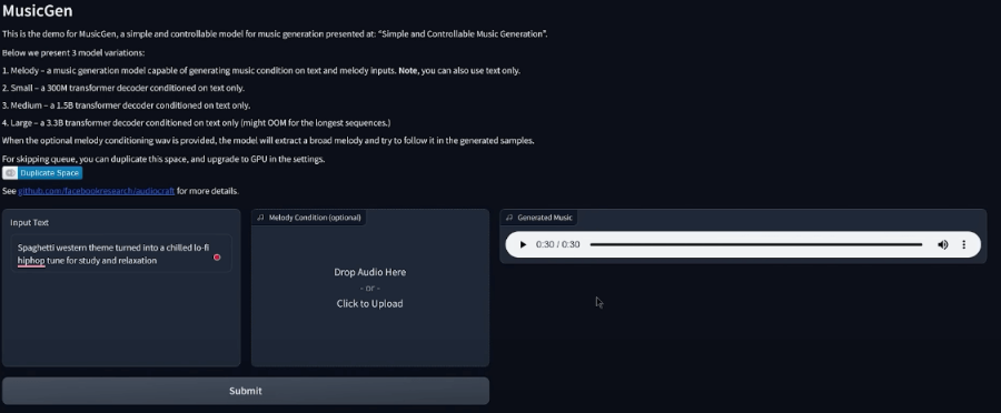 Meta 메타(전 페이스북)의 오디오 크래프트 연구팀이 텍스트 프롬프트를 기반으로 새로운 음악을 생성하고 기존 노래에 맞춰 조정할 수 있는 오픈 소스 딥러닝 언어 모델인 뮤직젠 MusicGen을 출시했습니다. 이 모델은 현재 데모버전으로 나와있지만, 오디오용 ChatGPT라고 할 수 있습니다. 원하는 음악 스타일을 설명하고 기존 곡을 드롭한 다음(선택 사항) "생성"을 클릭하면 됩니다. 상당한 시간(제 경우에는 약 160초)이 지나면 텍스트 프롬프트와 멜로디를 기반으로 완전히 새로운 음악이 짧게 재생됩니다.