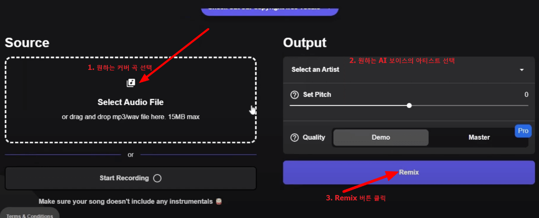 나오는 화면에서 좌측에 있는 Source, Output에 본인이 사용하고 싶고 만들고 싶은 음악과 아티스트를 선택하고 "Remix"버튼을 누르면 AI 유명인 커버가 생성됩니다. 아래 이미지처럼 1번부터 3번까지 순서대로 채우시면 됩니다.