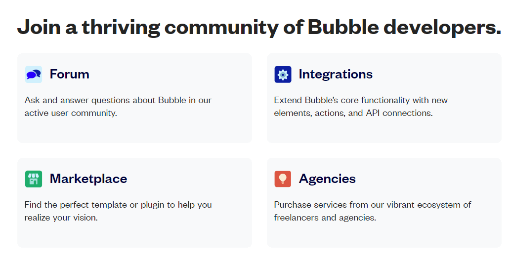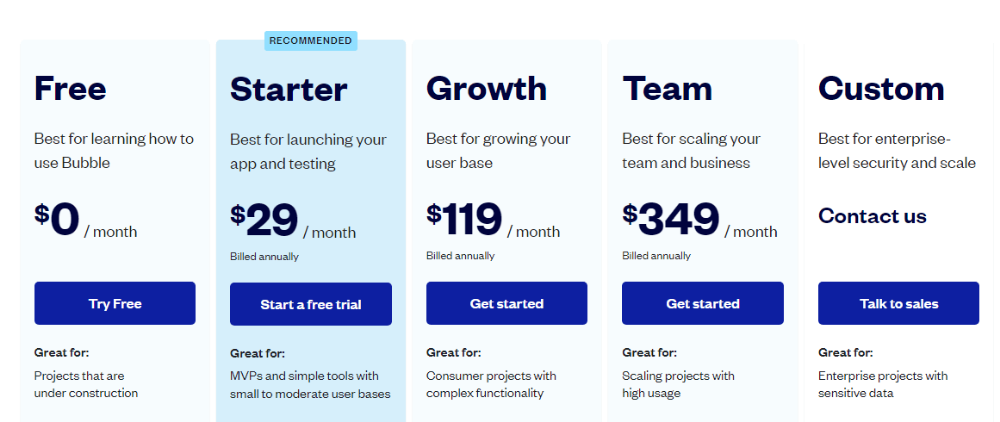버블은 다양한 요구와 예산을 가진 사용자를 수용하기 위해 계층화된 가격 구조를 제공합니다. 이름에서 알 수 있듯이 무료 플랜은 비용이 들지 않아 노코드 앱 개발에 입문하려는 사용자에게 훌륭한 노코드의 시작이 가능한 서비스입니다. 앱을 출시하려는 경우 월 $32의 스타터 요금제를 사용하면 라이브 앱, 사용자 정의 도메인 및 반복 워크플로우가 추가됩니다. 월 $134의 성장 요금제는 프리미엄 버전 제어 및 2단계 인증과 같은 추가 기능으로 사용자 기반을 늘리는 데 적합합니다. 월 399달러의 Team 요금제는 팀 및 비즈니스 확장을 위해 설계되었으며, 하위 앱 및 워크로드 단위 증가와 같은 기능을 제공합니다.