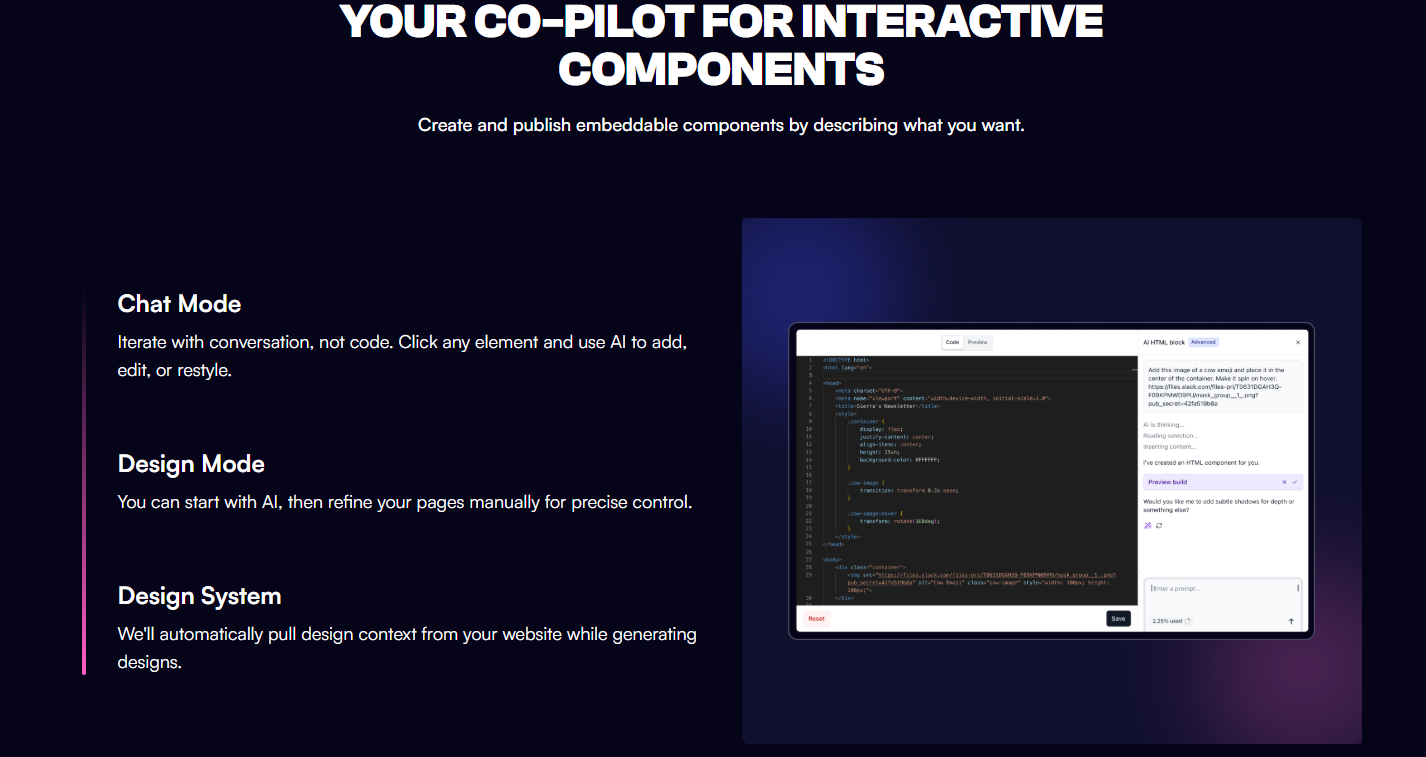 Beehiiv AI는 여기서도 패턴을 파괴합니다. 여러분이 원하는 인터랙티브 요소를 설명만 하면 AI가 코드를 대신 짜서 발행 가능한 컴포넌트로 만들어줍니다.