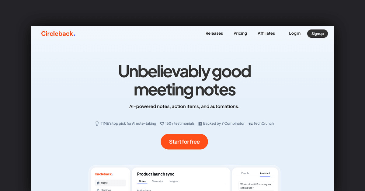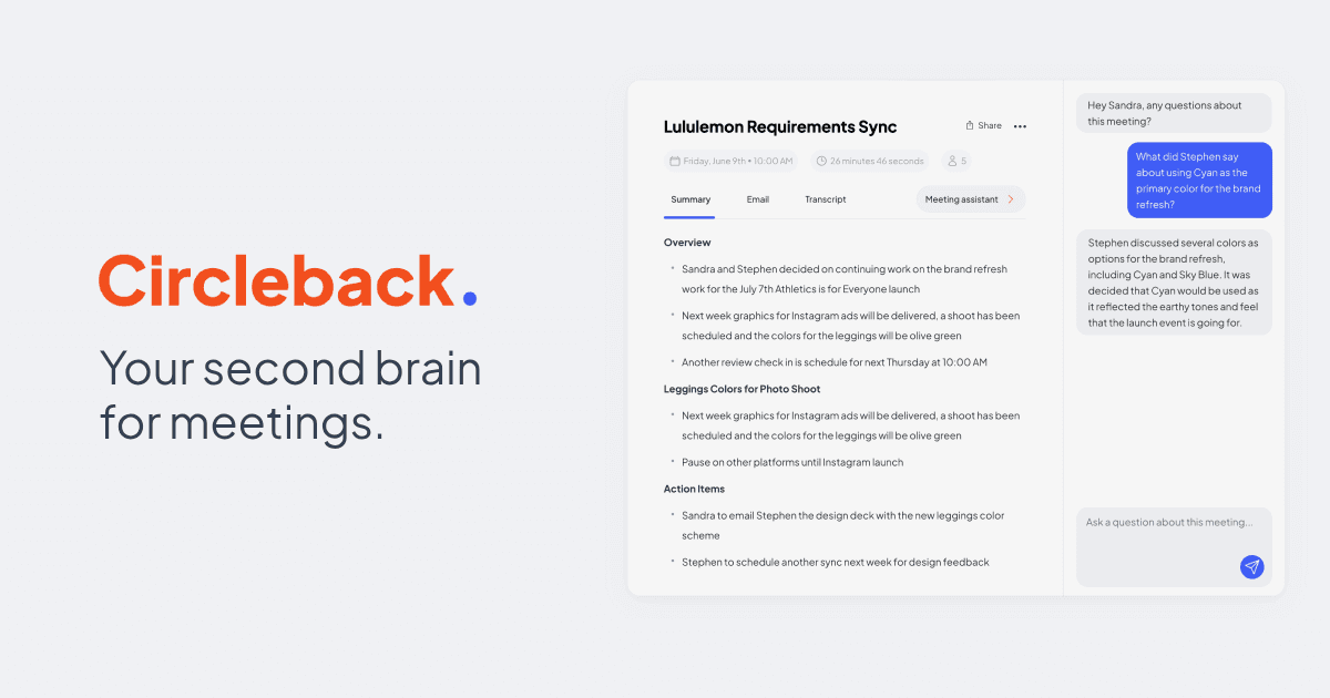 써클백 AI는 회의 내용을 자동으로 기록하고 요약하여 생산성을 높이는 AI 기반 회의 어시스턴트입니다. 다양한 회의 플랫폼과 연동되어 회의 후 자동으로 노트와 실행 항목을 생성하며, 팀 단위로 협업이 필요한 경우에도 효과적으로 활용할 수 있습니다.