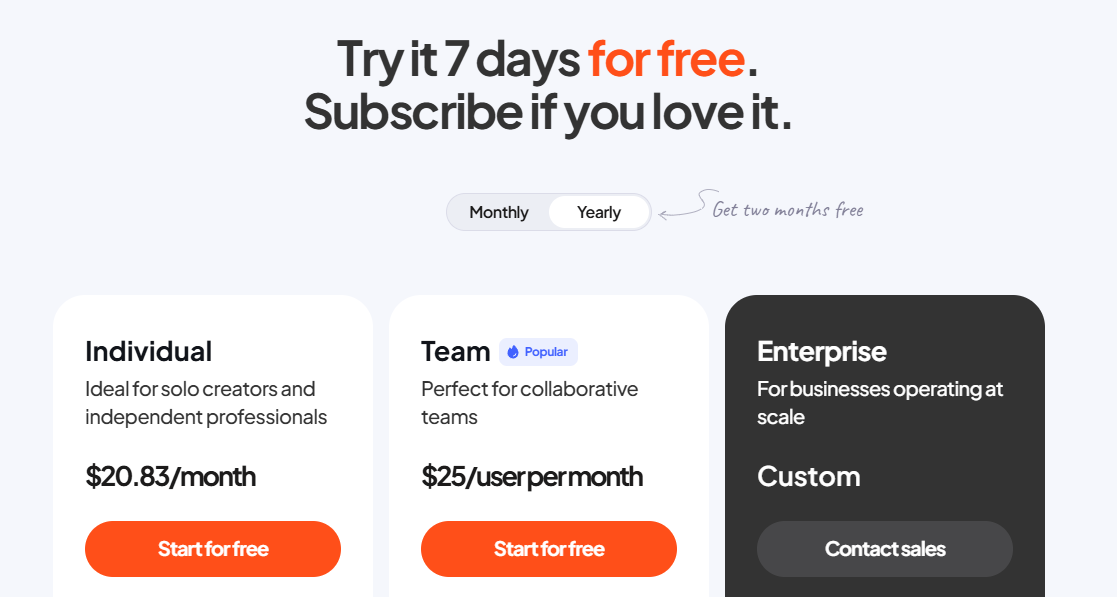 각 플랜은 회의 기록 및 요약 기능을 기반으로 하며, 팀 단위로 협업이 필요한 경우 Team Plan을 추천합니다. 현재는 7일간 무료로 체험해보실 수 있습니다.