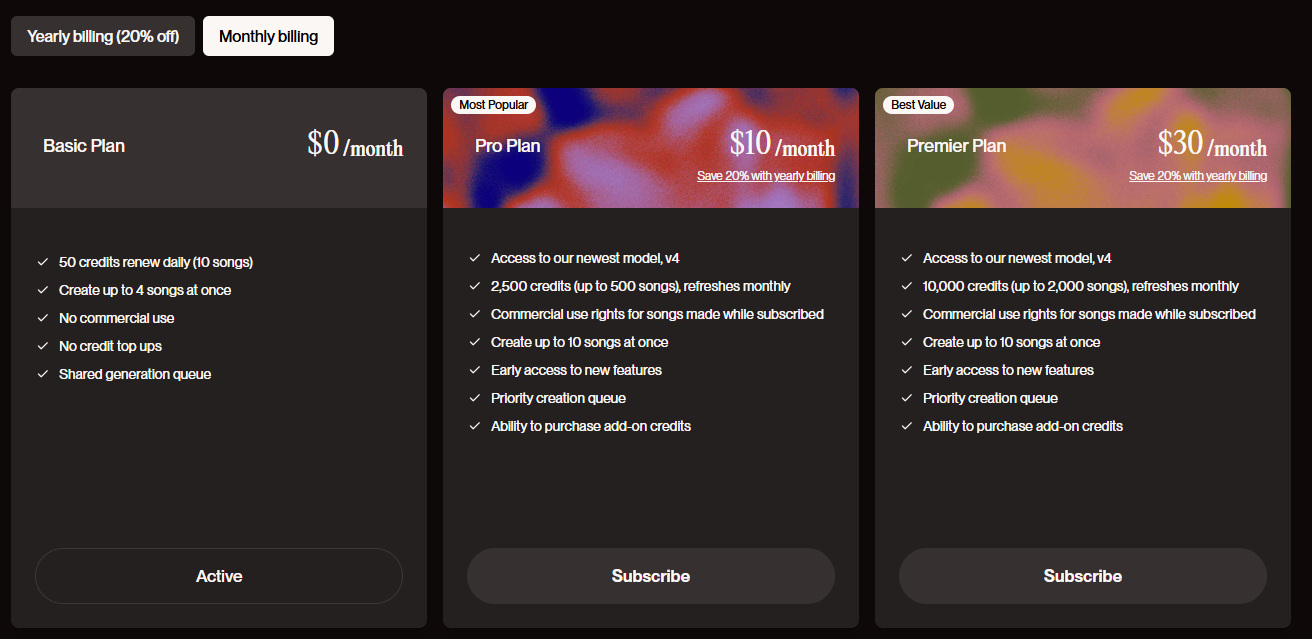 - Premier Plan (월 $30): 월 10000 크레딧 제공, 최대 1000곡 생성 가능, 상업적 이용 가능