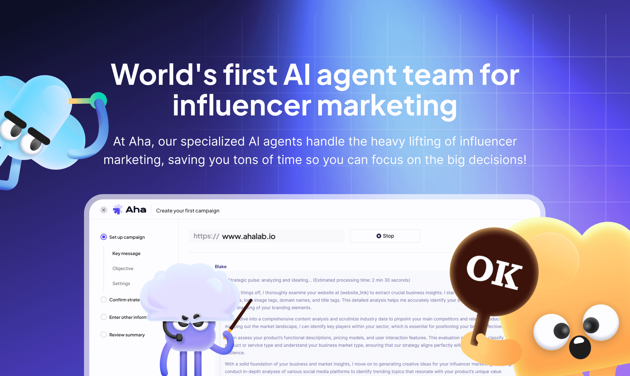Aha AI의 AI 에이전트 팀이 3M+ 인플루언서 네트워크를 활용하여 브랜드에 적합한 인플루언서를 매칭하고, 캠페인을 자동으로 실행합니다.
