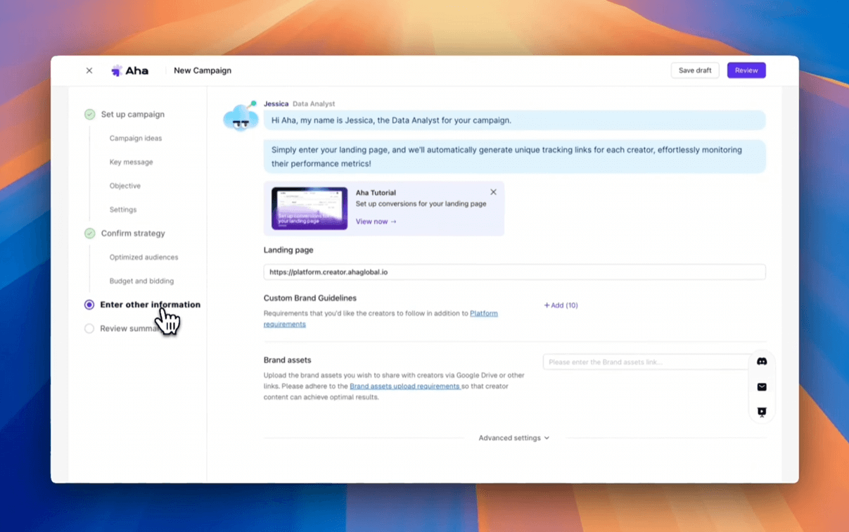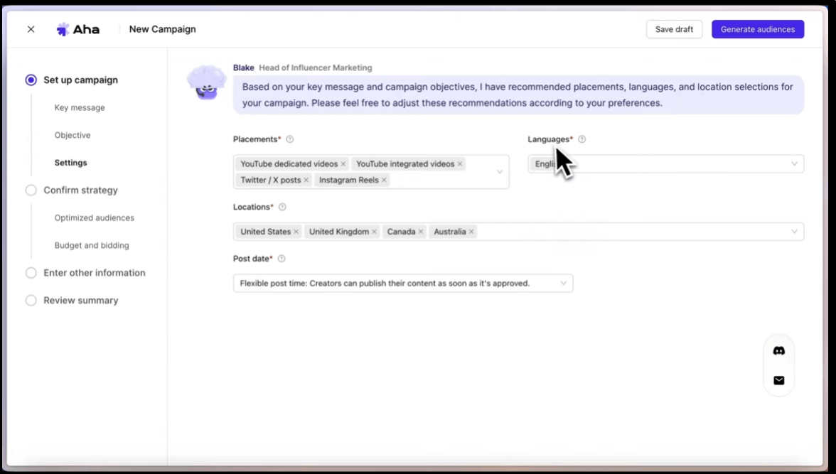 브랜드 정보를 입력하고, 타겟 오디언스와 캠페인 목표를 설정합니다. Aha AI는 이를 기반으로 최적의 인플루언서 매칭을 제공합니다.