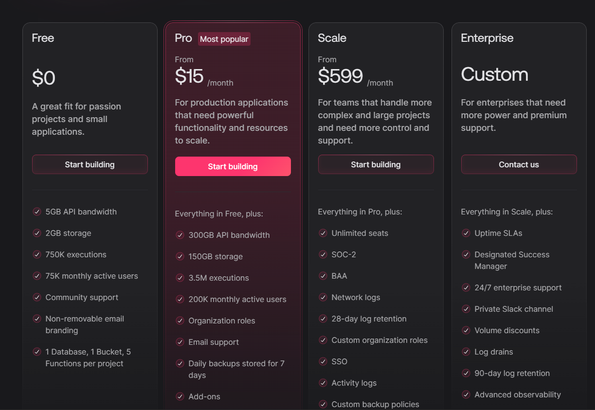 - Pro 플랜: 월 $15부터 시작, 확장 가능한 리소스 및 우선 지원