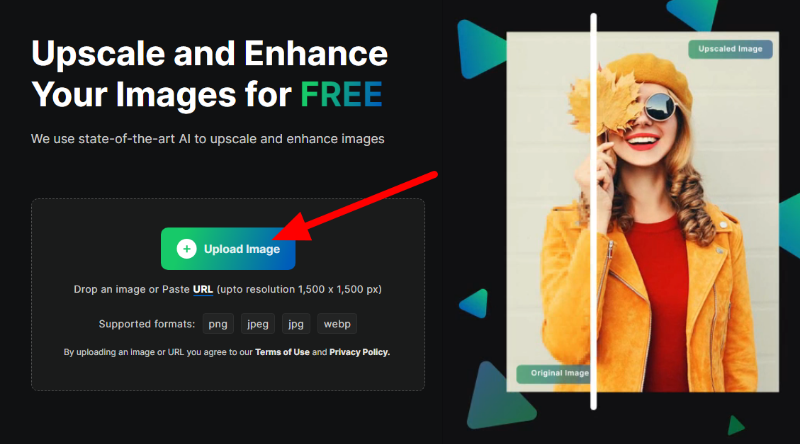 별도 가입없이도 업스케일 미디어 사이트 첫 화면에서 바로 이미지 해상도 올리기가 가능합니다. "Upload Image" 버튼을 클릭 후 원하시는 사진을 넣으면 바로 결과를 확인할 수 있습니다.