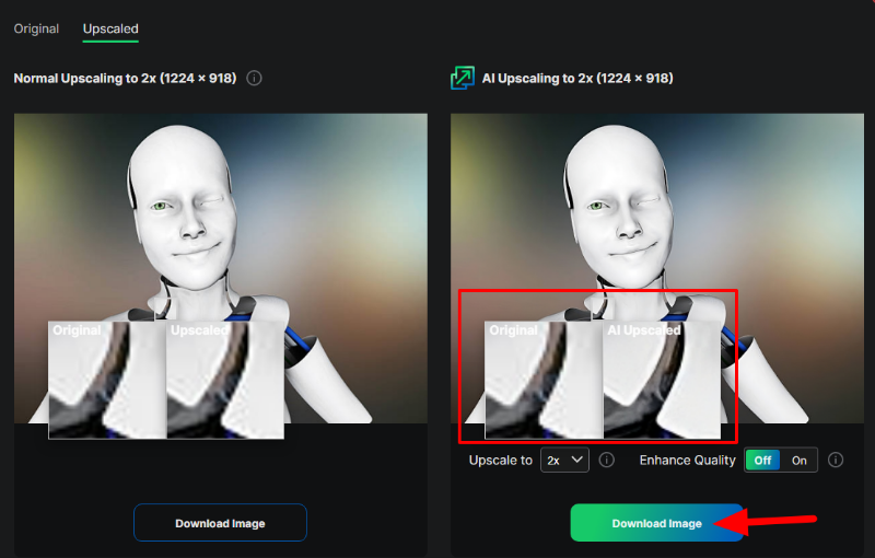 임의로 위와 같은 사진을 넣어 AI 사진 해상도 높이기를 보시면 오리지널과 픽셀을 비교했을 때 차이가 꽤나 많이 납니다.  해상도가 올라간 이미지를 얻고 싶으시다면 이미지 바로 아래 "Download Image"를 누르면 됩니다.