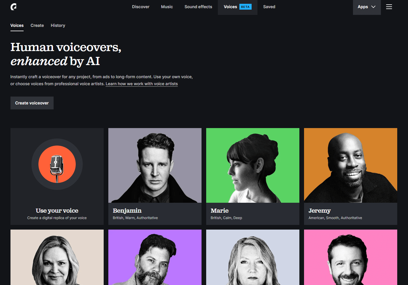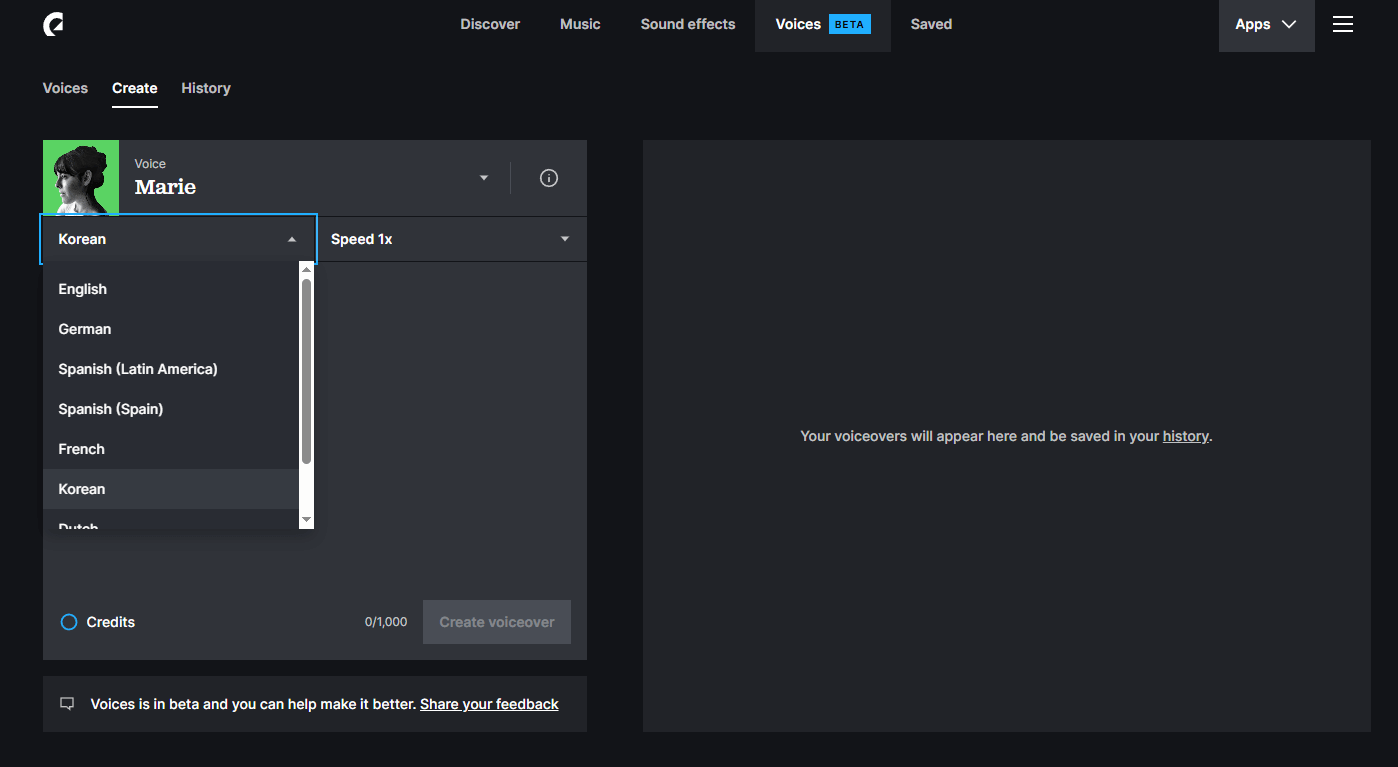 Epidemic Sound 계정에 로그인한 후, 상단 내비게이션 바에서 Voices 메뉴를 선택하여 Voices 개요 페이지로 이동합니다.