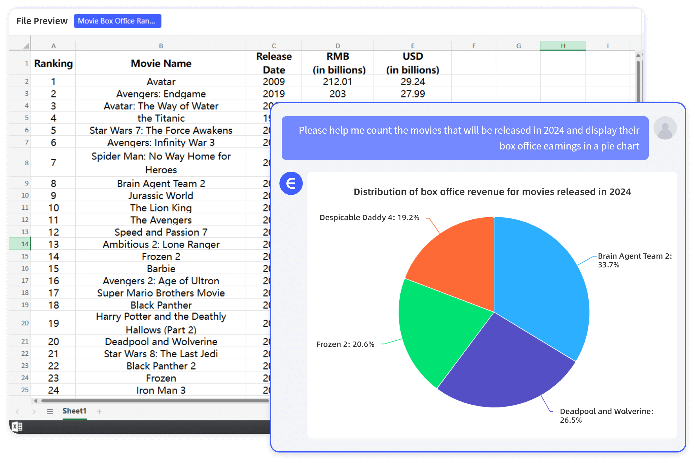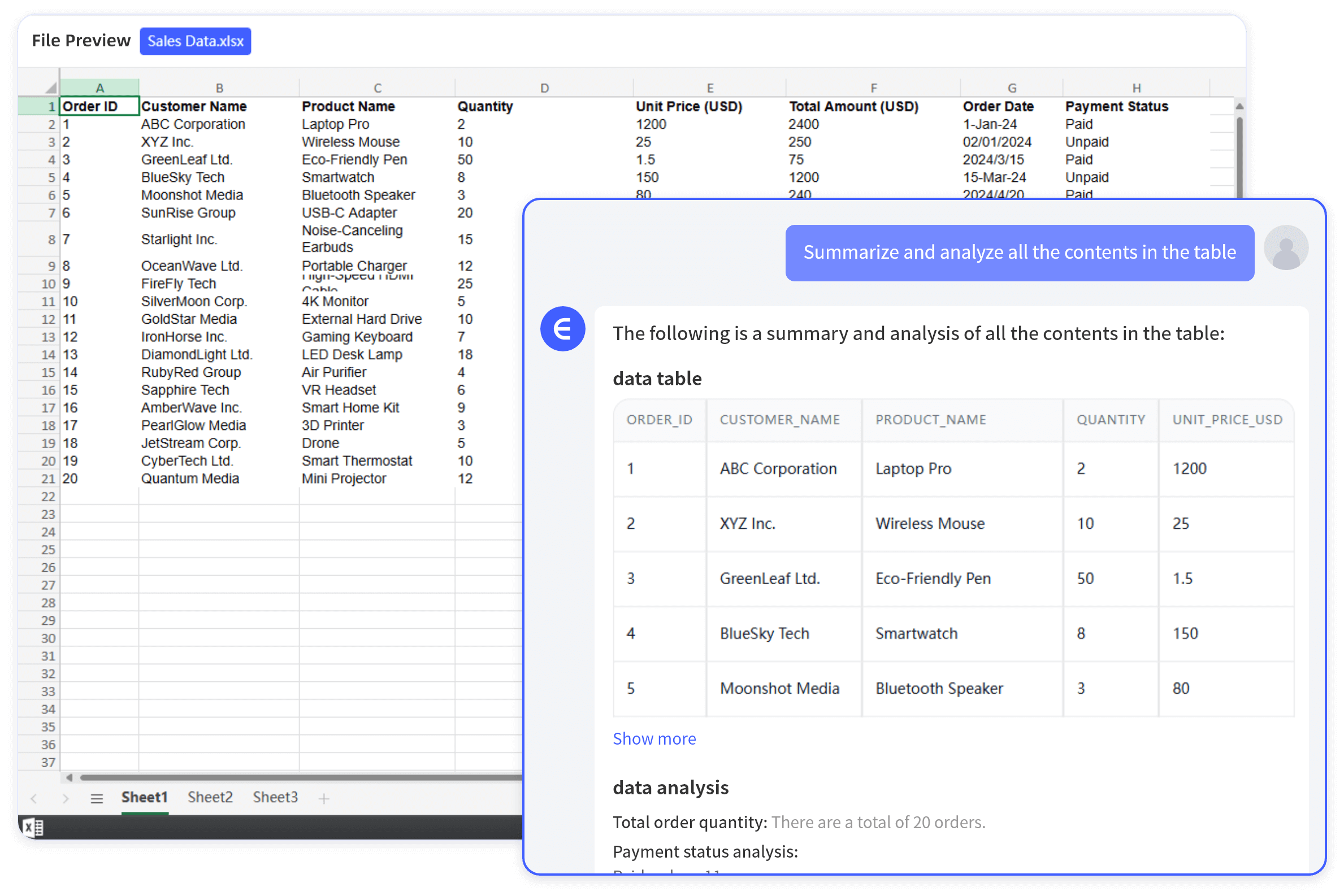 업로드한 데이터에 대해 자연어로 질문을 입력하면, AI가 해당 질문을 이해하고 즉시 분석 결과를 제공합니다. 예를 들어, "2024년 월별 매출 추이를 보여줘"와 같은 질문이 가능합니다.