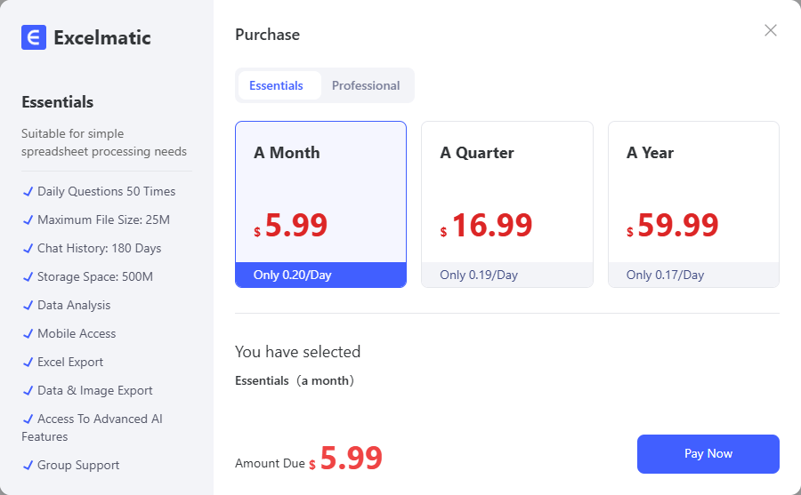 ExcelMatic AI는 무료 체험을 제공하며, 이후에는 유료 플랜을 통해 추가 기능을 이용할 수 있습니다. 정확한 요금 정보는 위 이미지를 참고하면 알 수 있는 것처럼 기본 등급이 한 달에 5.99달러 입니다.