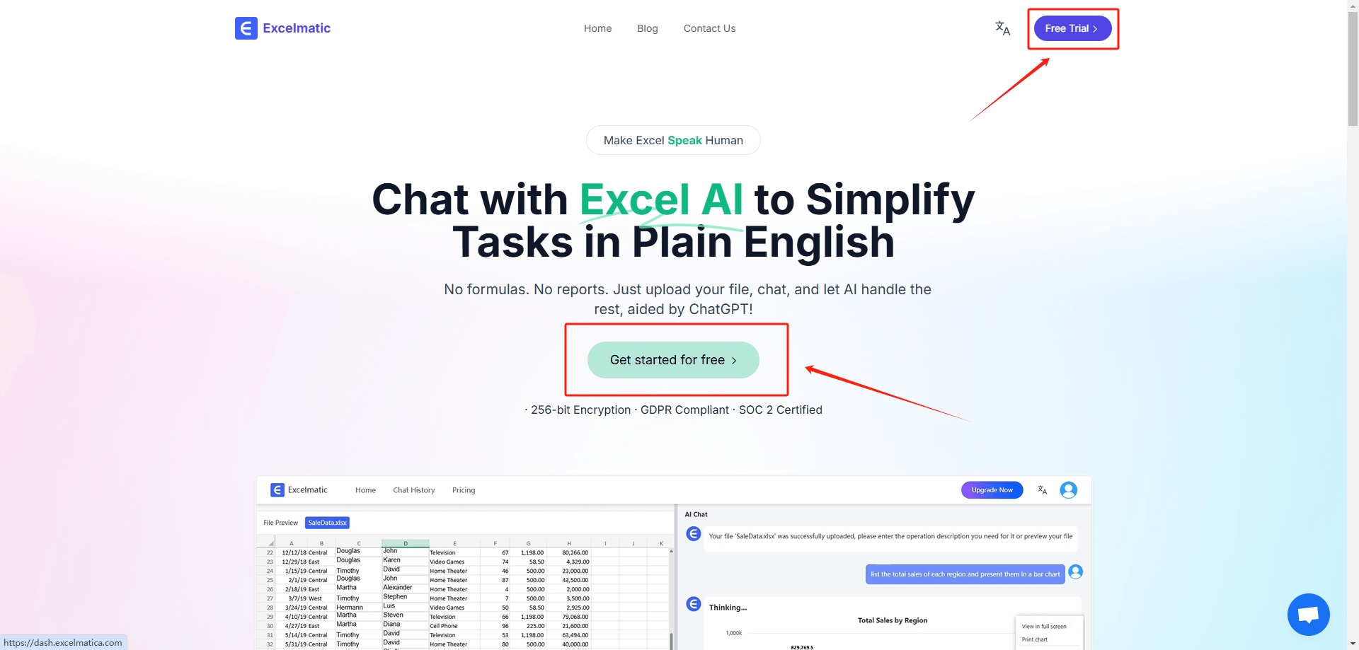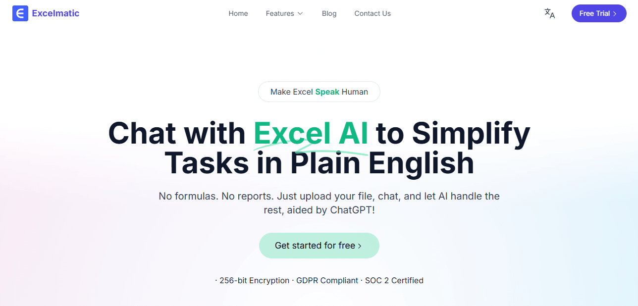 ExcelMatic AI에 접속하여 분석할 엑셀(.xlsx) 또는 CSV 파일을 업로드합니다. 파일은 안전하게 처리되며, 256비트 암호화와 GDPR, SOC 2 인증을 통해 데이터 보안이 보장됩니다.