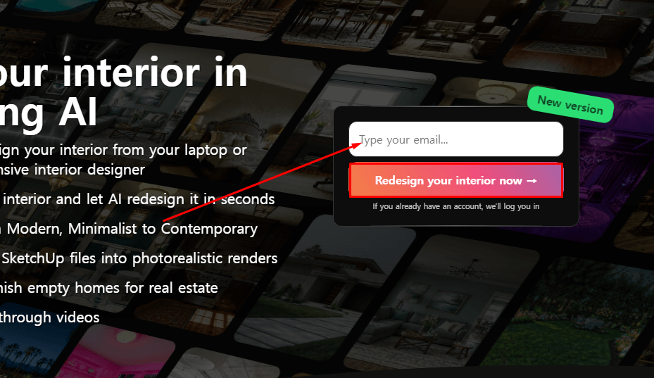홈페이지 접속 시 중앙에 보이는 이메일을 적는 란에서 본인의 이메일 계정 주소를 작성하시고, 하단에 'Redesign your interior now' 버튼을 클릭하시면, 메일이 하나 옵니다. 그리고 메일에 온 주소를 클릭하면 쉽게 가입이 완료됩니다.