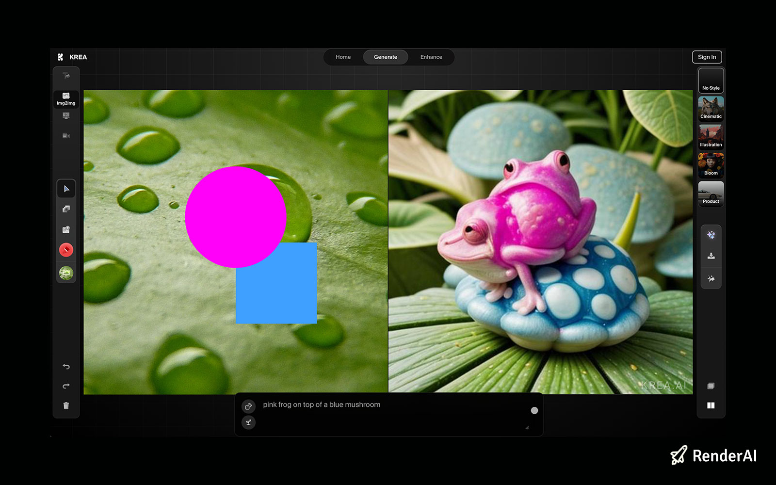 로그인 후 'Realtime' 메뉴에서 실시간 프롬프트 생성 기능을 사용할 수 있으며, 텍스트 외에도 낙서, 도형 등 다양한 요소를 조합해 이미지를 생성할 수 있습니다. 또한 이미지 업스케일, 비디오 생성, 3D 오브젝트 생성까지 폭넓은 기능을 제공합니다.