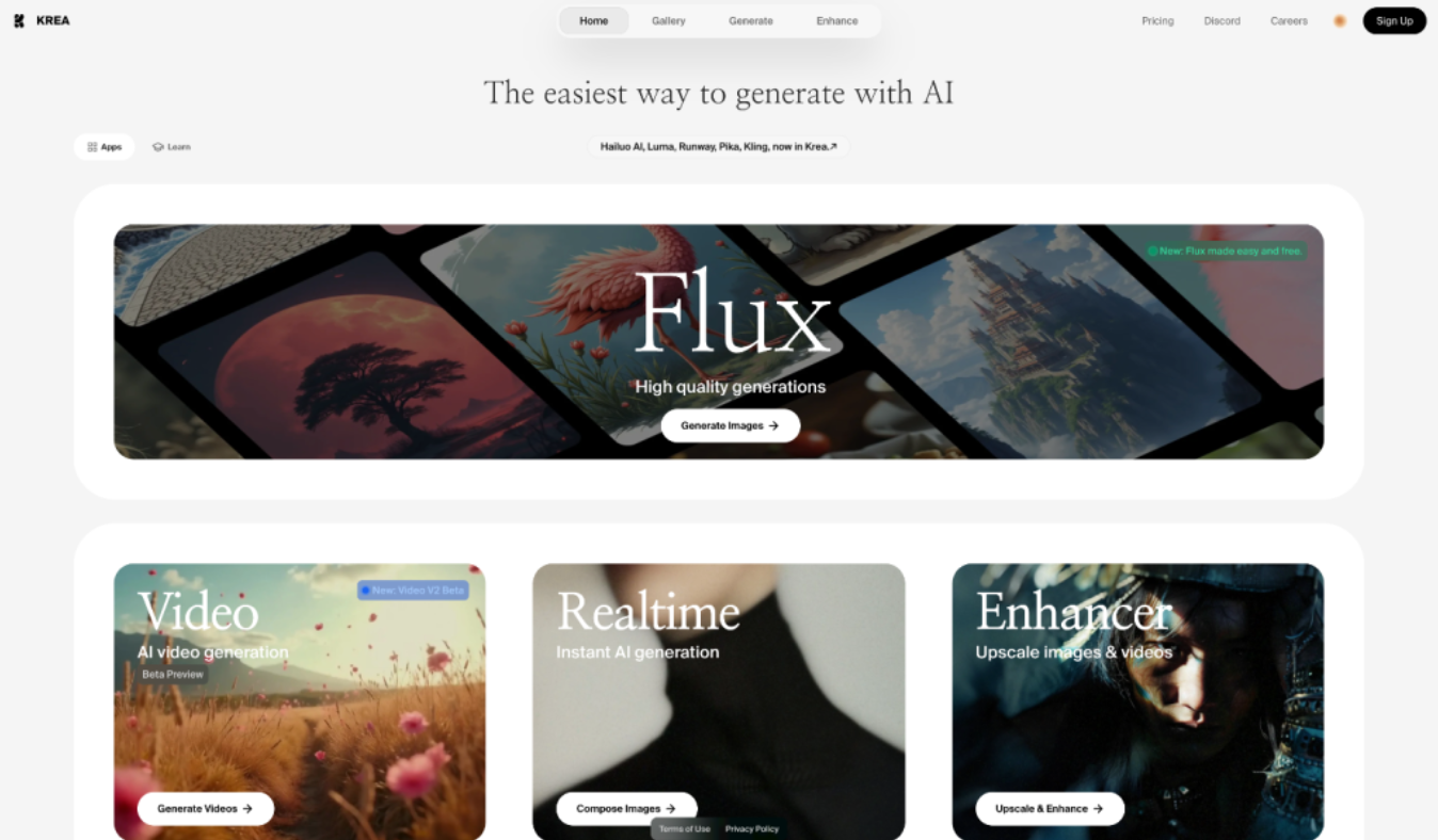 크레아 AI(Krea AI)는 텍스트 프롬프트 기반의 실시간 이미지 및 영상 생성 플랫폼으로, 디자인, 영상 제작, 3D 모델링에 적합한 크리에이티브 도구입니다. 누구나 직관적인 UI를 통해 자신만의 AI 콘텐츠를 만들 수 있어 영상 크리에이터, 디자이너, 개발자 등에게 매우 유용한 도구입니다.