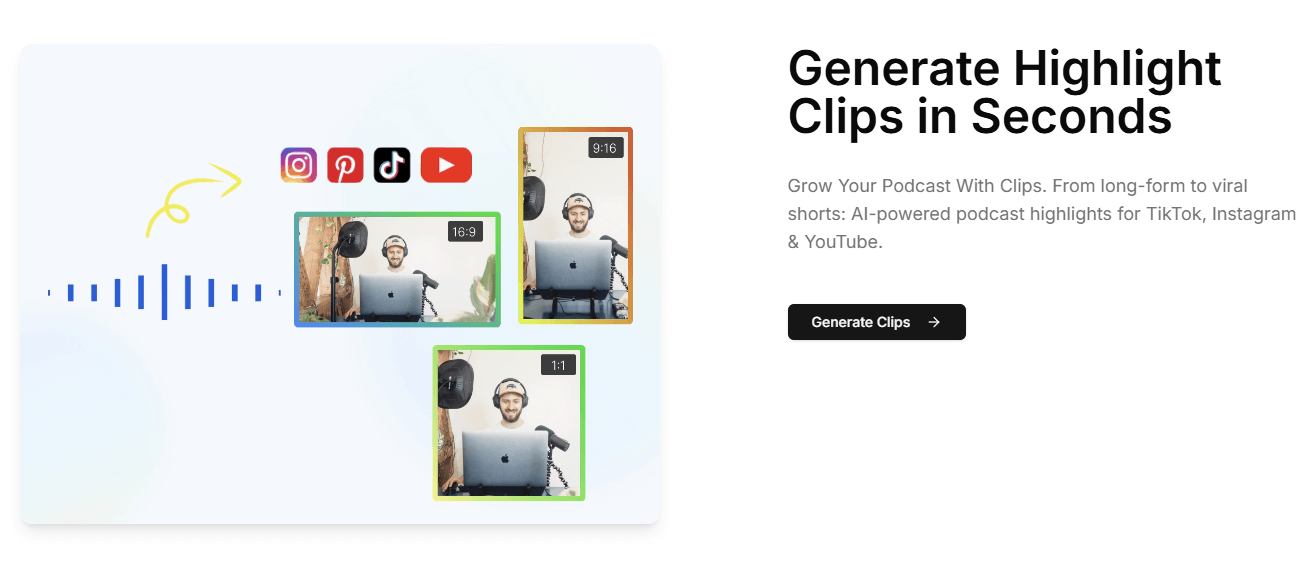 팟캐스트 AI가 자동으로 팟캐스트의 핵심 부분을 추출하여 하이라이트 클립을 생성하고, 이를 기반으로 소셜 미디어 게시물을 제작합니다. TikTok, Instagram, YouTube Shorts 등에 최적화된 콘텐츠를 손쉽게 만들 수 있습니다.