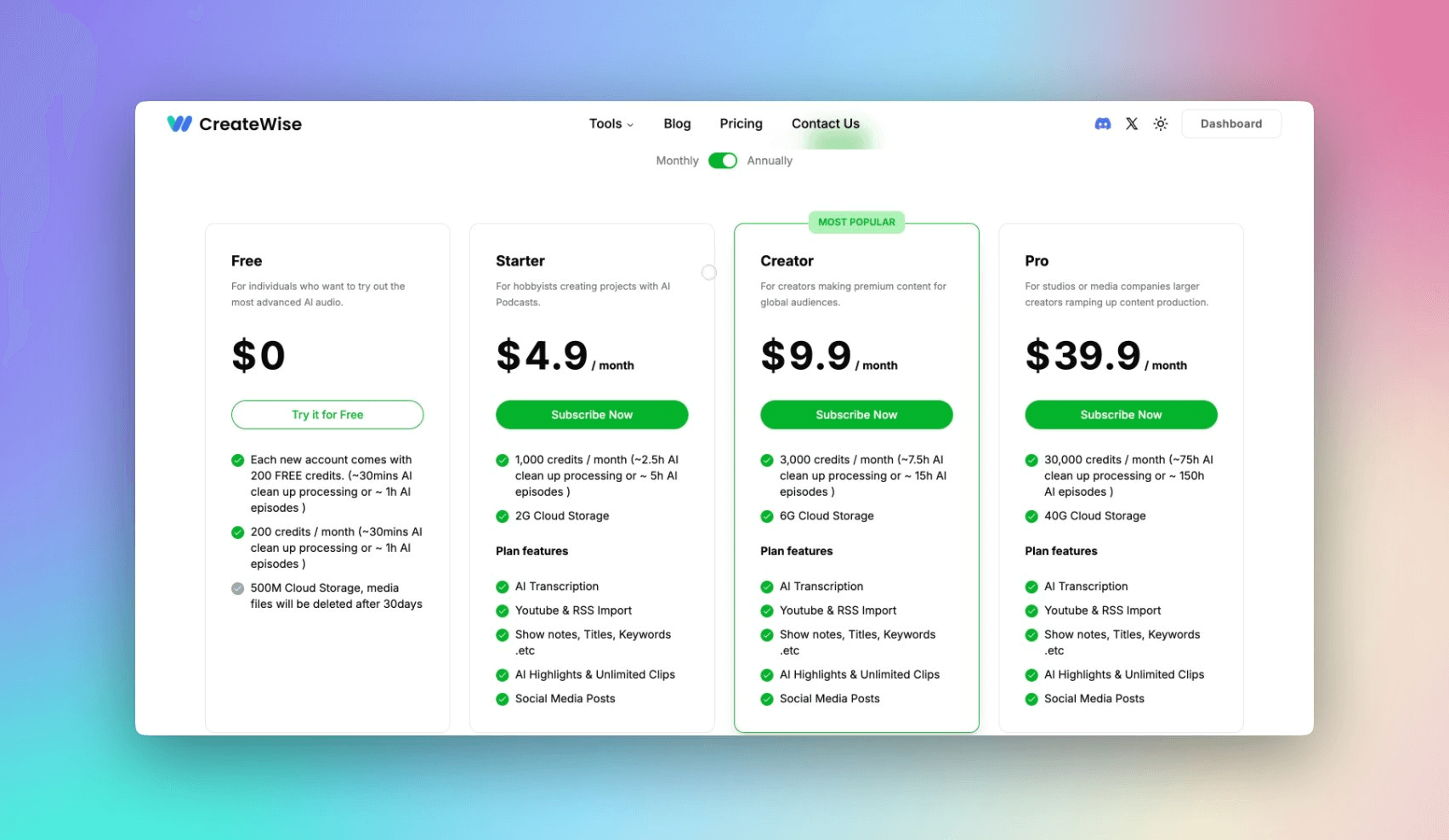 CreateWise AI는 다양한 플랜을 제공하여 사용자의 필요에 맞게 선택할 수 있습니다: