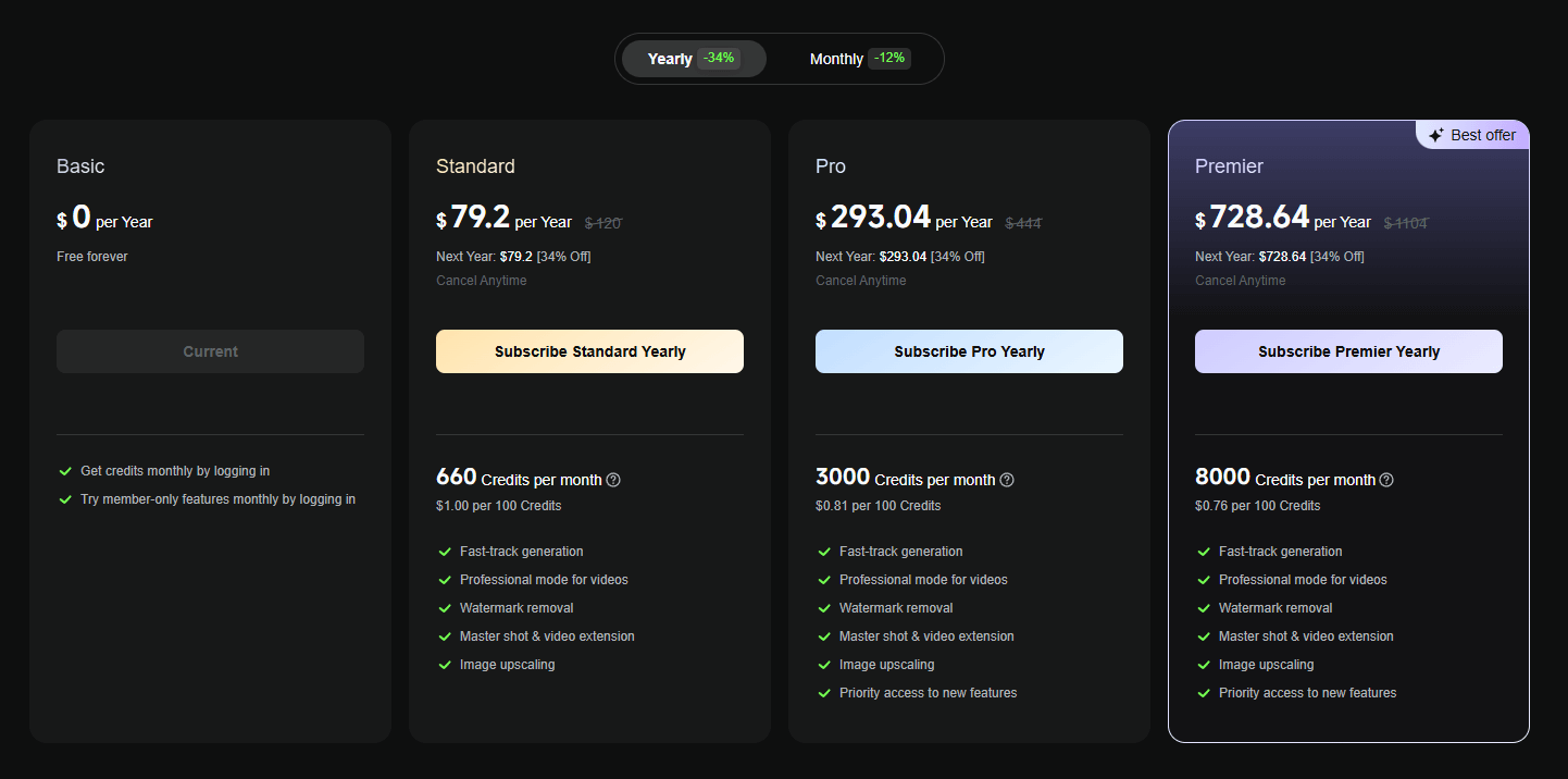 Kling AI는 무료 및 유료 플랜을 제공하며, 사용자의 필요에 따라 선택할 수 있습니다. 무료 플랜은 매일 66개의 크레딧이 제공되며, 기본적인 영상 제작이 가능합니다. 유료 플랜은 다음과 같습니다: