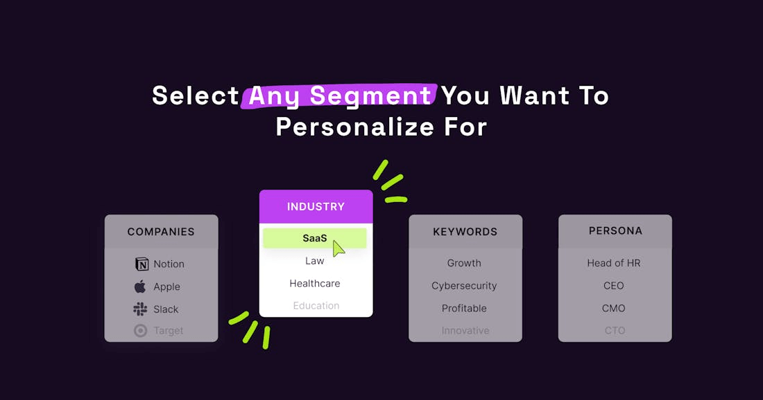 1:1 ABM(특정 회사/연락처), 산업(SaaS, 헬스케어 등), 페르소나(CMO, CTO 등), SEO 키워드를 선택하여 타겟 세그먼트를 지정합니다.