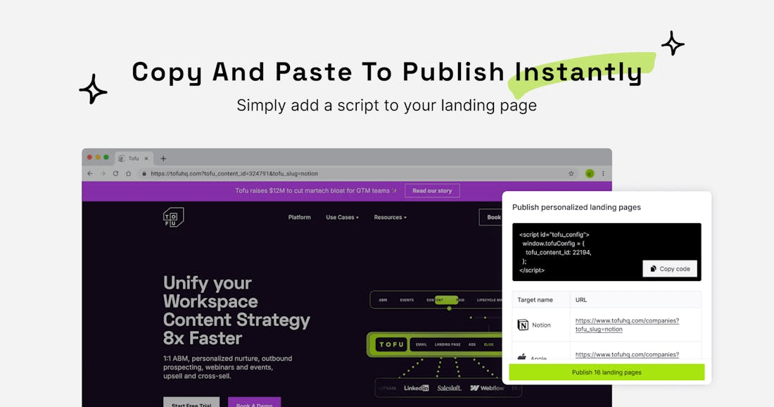 - AI 기반으로 1:1 ABM, 산업, 페르소나, SEO 키워드별 랜딩 페이지 생성