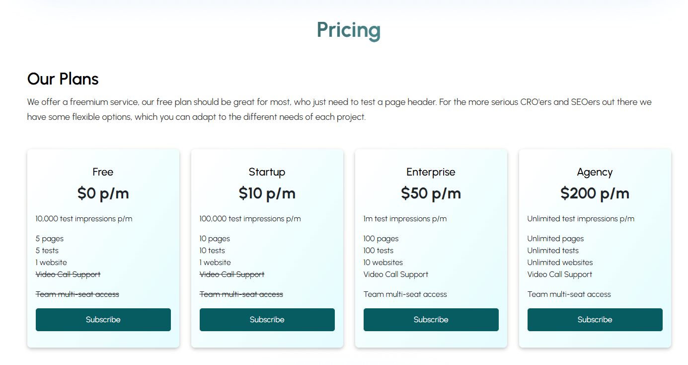 - Agency Plan ($200/월): 무제한 페이지, 무제한 테스트, 무제한 테스트 노출 제공