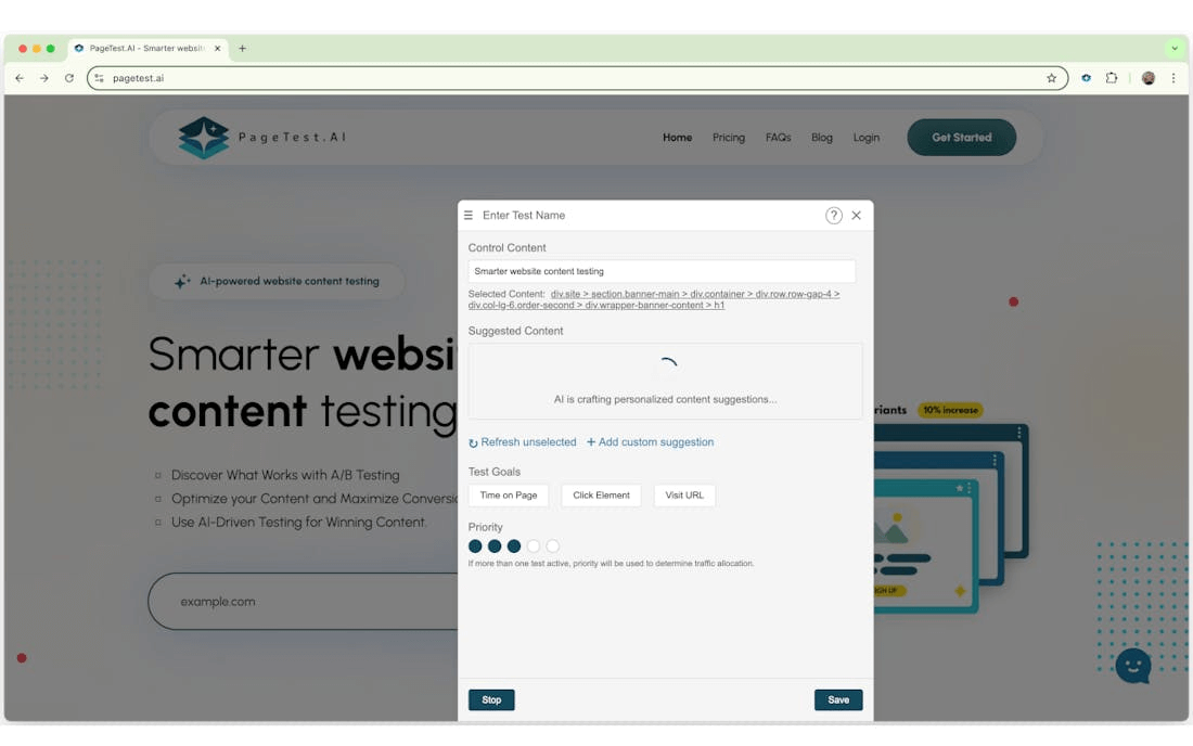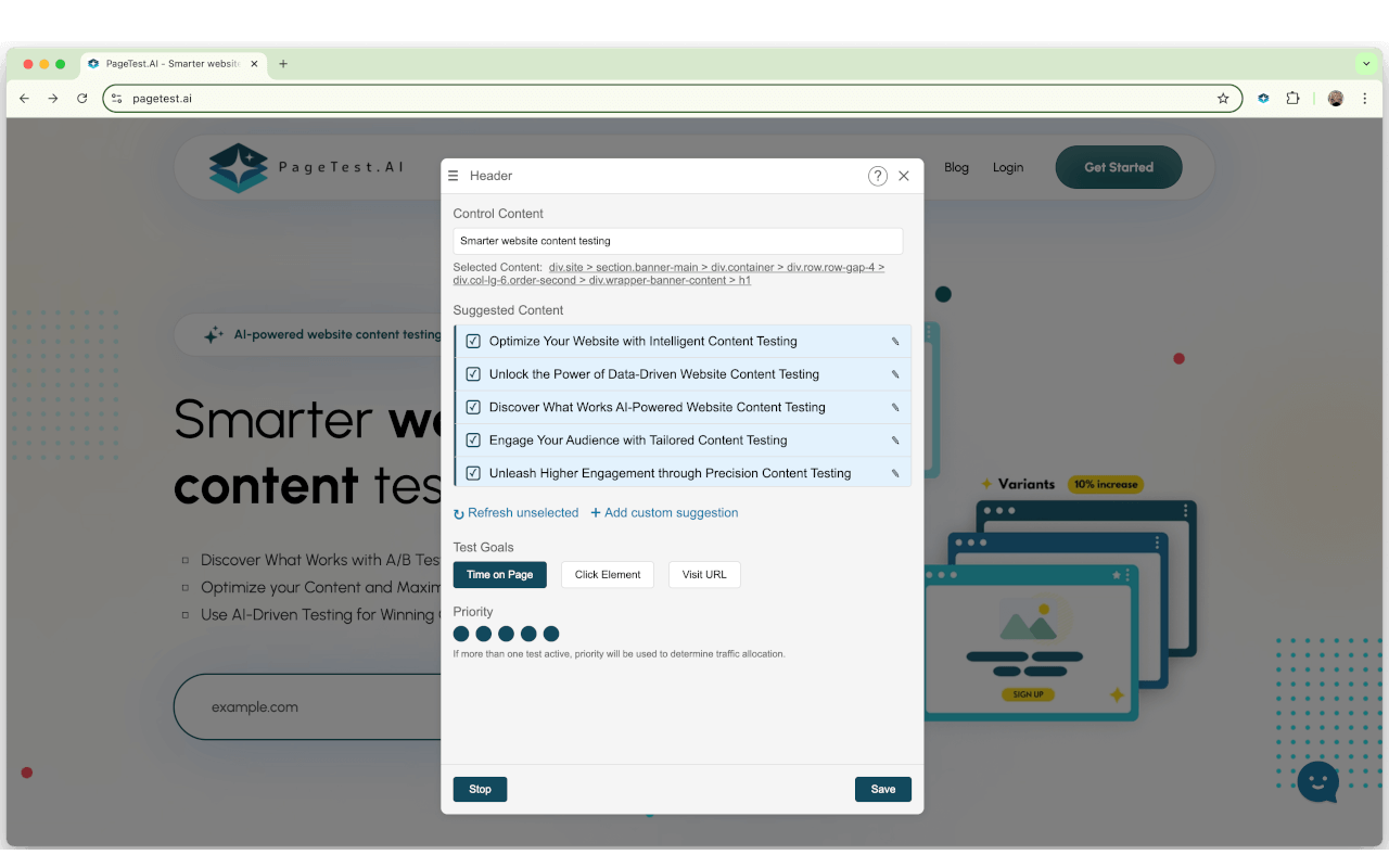 선택한 요소에 대해 다양한 변형을 생성하고, AI의 추천을 받아 최적의 콘텐츠를 테스트합니다. 테스트는 A/B 테스트 또는 다변량 테스트로 설정할 수 있으며, 실시간으로 결과를 확인할 수 있습니다.
