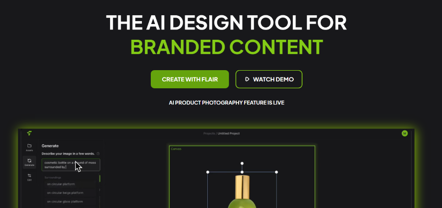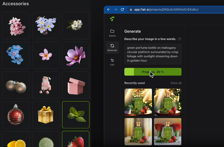 플레어 Flair를 사용하면 다양한 액세서리와 시각적 요소를 사용하여 제품 주변의 세계를 구축할 수 있습니다. 플랫폼의 AI 기술이 빈 공간을 채워주어 일관성 있고 시각적으로 멋진 장면을 생성합니다.