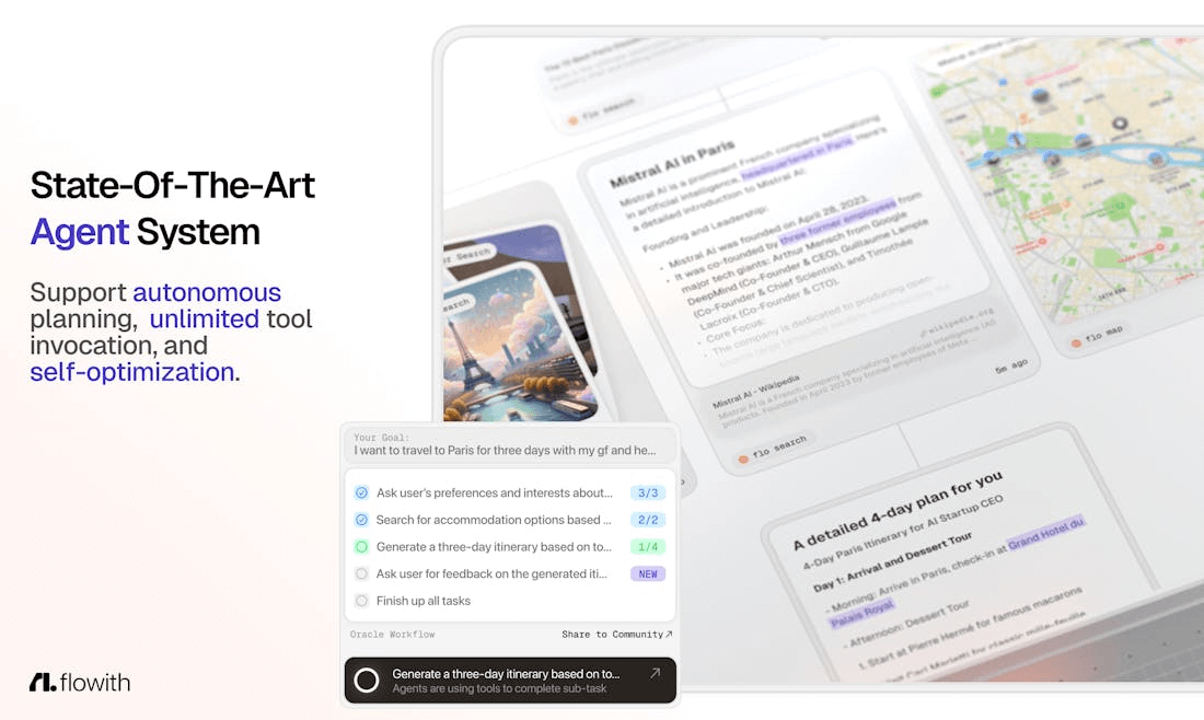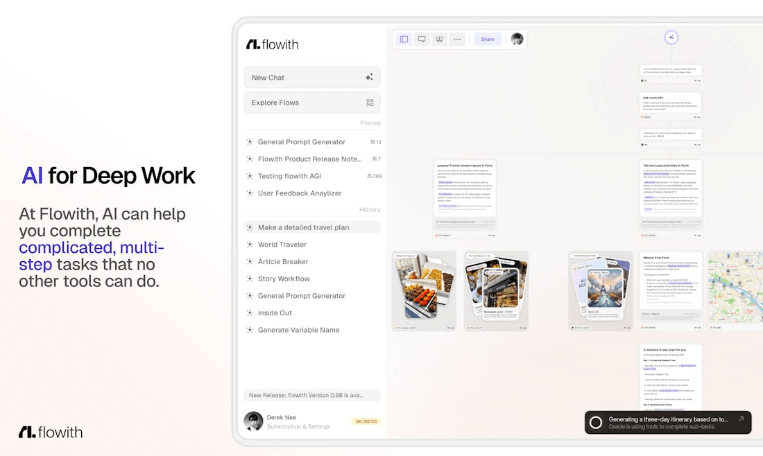 Flowith AI(플로위드 AI)는 전통적인 채팅 기반 AI 도구를 뛰어넘는 차세대 AI 생산성 플랫폼입니다. 2차원 캔버스 기반 인터페이스를 통해 다중 스레드 대화와 복잡한 작업을 간소화하며, 사용자 의도를 자동으로 파악하는 Oracle 모드를 통해 생산성과 창의성을 극대화합니다. 콘텐츠 생성, 학술 연구, 팀 협업, 전략 기획 등 다양한 워크플로우에서 활용 가능하며, 개인 지식을 체계적으로 관리하는 Knowledge Garden 기능으로 더욱 강력한 AI 경험을 제공합니다.
