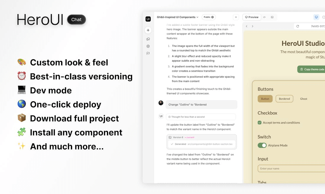 HeroUI Chat AI (히어로UI 챗)는 자연어 프롬프트만으로 실제 코딩 없이 UI를 생성해주는 혁신적인 웹 기반 인공지능 플랫폼입니다. React 기반 프론트엔드 프로젝트 개발에 탁월한 도움을 주며, 개발자뿐 아니라 디자이너와 기획자까지 누구나 손쉽게 사용할 수 있습니다.
