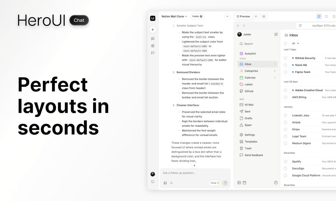 스크린샷을 업로드하면, HeroUI가 이미지 속 UI를 분석하여 동일한 기능과 디자인을 가진 코드로 재현해줍니다. 디자인 모방 및 코드 복원에 매우 유용합니다.