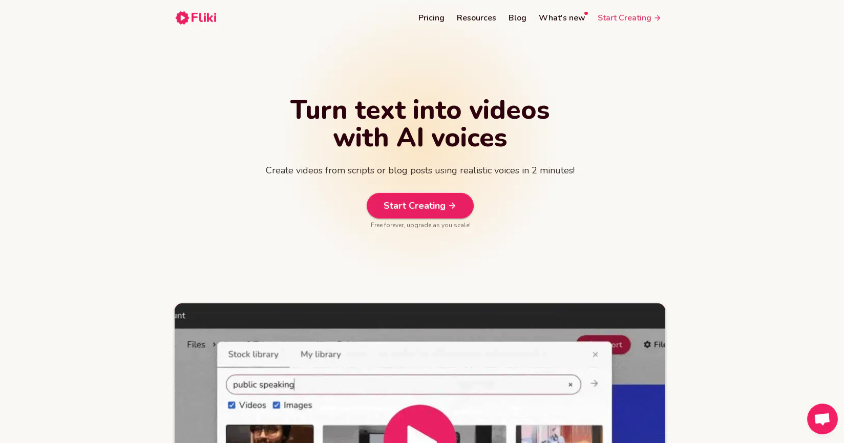 AI 음성으로 텍스트를 비디오로 변환하는 서비스입니다. 단 2분 만에 사실적인 음성을 사용하여 스크립트 또는 블로그 게시물를 비디오로 만들 수 있는 영상 크리에이터분들에게 적합한 AI 입니다. 블로그 기사 URL을 추가하여 시작하면 AI로 구동되는 플리키(Fliki)가 콘텐츠를 요약하고 이미지를 찾고 자막과 함께 사람 같은 보이스가 포함된 비디오를 생성해줍니다.