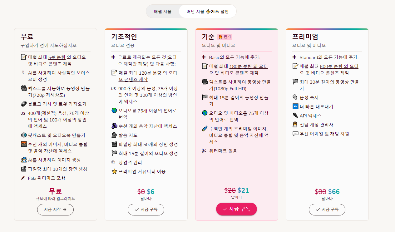 현재 플리키 서비스는 부분유료로 위 이미지와 같이 무료로도 매월 최대 5분 분량의 오디오 및 비디오 콘텐츠 제작이 가능합니다. 또한 무료로 사용하실 경우는 720p 해상도의 영상만 출력된다는 것을 유의하세요. 무료로 시작하셨다가 서비스가 괜찮으시면, 구독하여 월 6~21달러 스탠다드형까지 추천합니다.