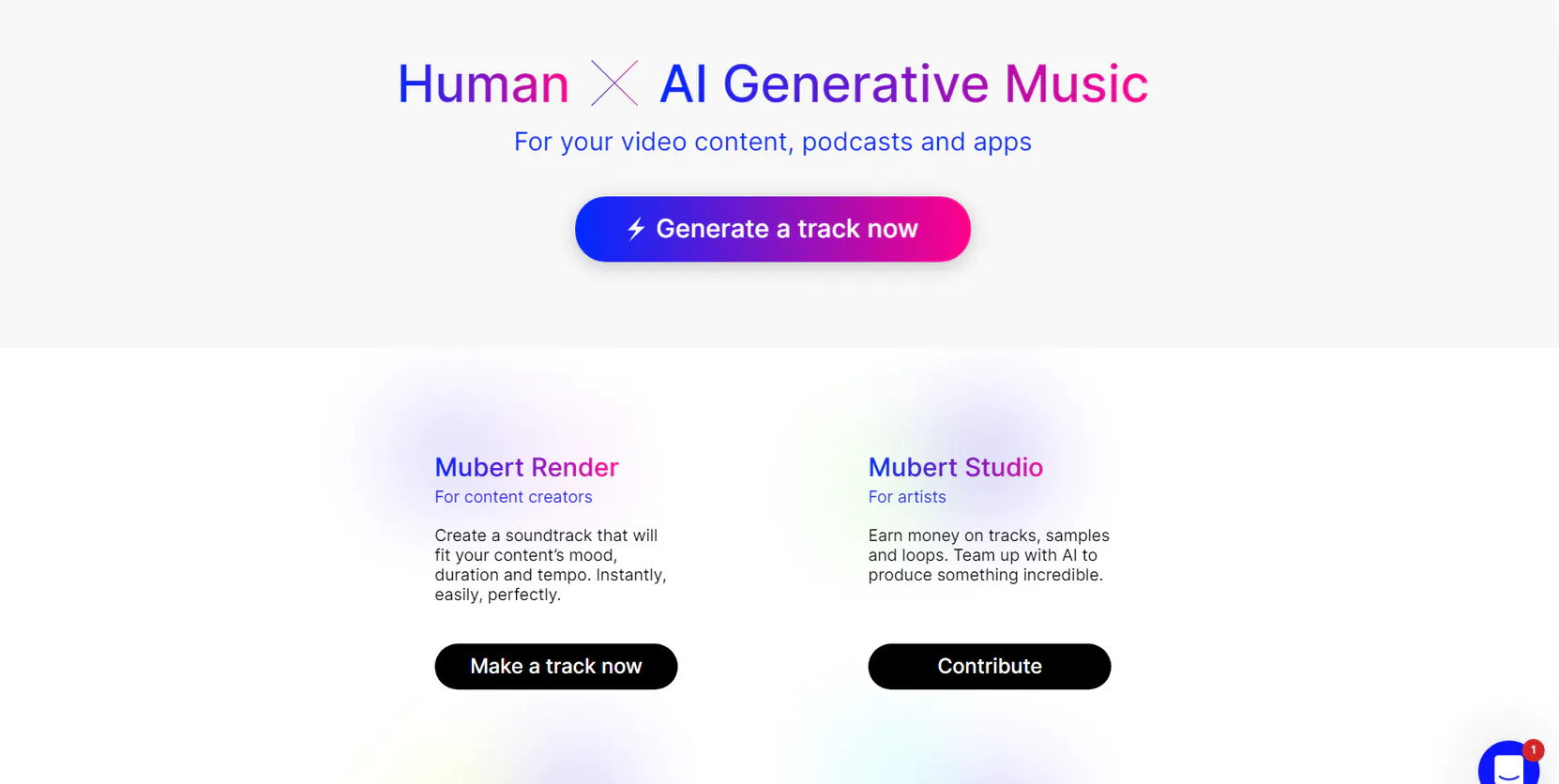 새로운 AI 작곡을 시작해 보세요. 수백 명의 아티스트가 제공하는 수백만 개의 음악 샘플이 뮤버트 Mubert에 입력되면 AI가 이를 취합합니다. 저작권이 없는 새로운 음악이 즉시 생성되며, 인공 지능의 능력과 일반인도 음악 프로듀서의 창의성을 가지게 되는 인간과 알고리즘 간의 공생 관계를 가능하게 합니다. 인간과 기술이 결합한 전례 없는 협업이 이루어집니다.