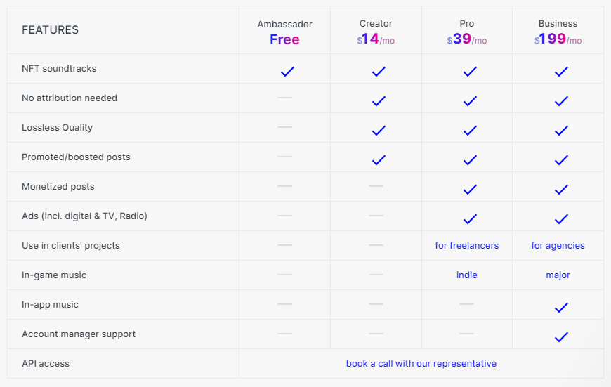 뮤버트(Mubert)의 경우 부분 유료 형태로 한 달에 25개 트랙으로 무료로도 사용이 가능합니다. 달에 14~199달러까지 다양한 유료 버전이 있는데 각 구독형태마다 제공하는 서비스들이 다릅니다. 무료로 먼저 사용해 보시고 마음에 드신다면, 결제해 보시는 것을 추천합니다.