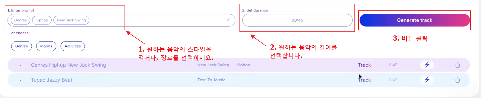 챗GPT처럼 1번에 자신이 원하는 스타일을 영어로 적어 넣거나, 아래에서 장르를 선택합니다. 그리고 음악의 길이를 정하고 버튼을 누르면 아래 AI 작곡된 음악들이 생성됩니다. 참 쉽죠?