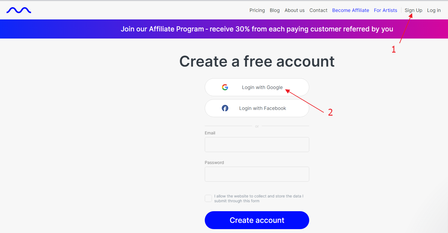 사이트로 접속 후 상단 메뉴바에 있는 "Sign Up" 버튼을 눌러줍니다. 그리고 나온 화면에서 우리에게 익숙한 구글을 눌러주면 구글 아이디로 바로 가입이 가능합니다. 만약 구글 아이디가 없다면 아래 이메일, 패스워드 기재 칸에 본인이 사용하는 이메일 주소와 새로운 비밀번호를 적고 "Create account" 버튼을 눌러주시면 가입 완료!